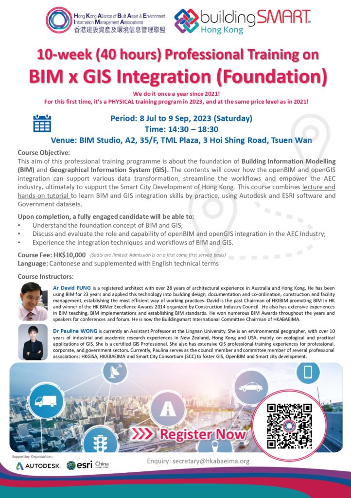 The course will be taught by professional BIM and GIS instructors, Ar David Fung and Dr Paulina Wong. Please click here for registration.