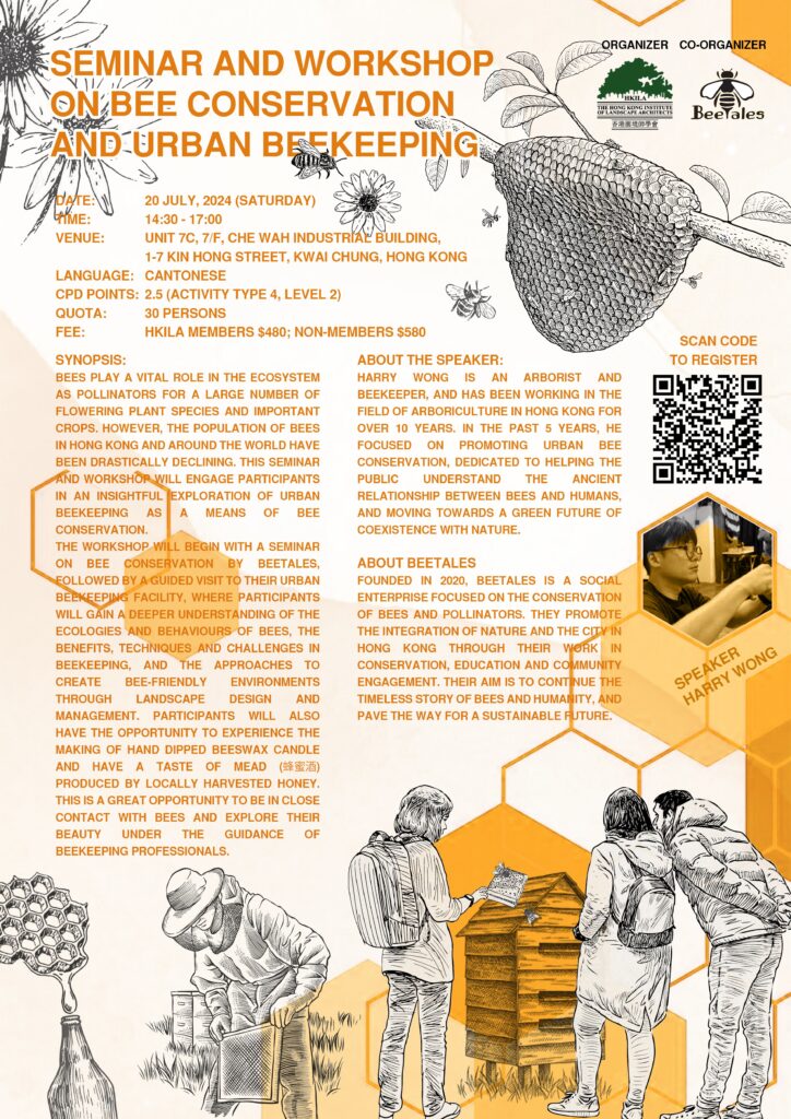 Bees play a vital role in the ecosystem as pollinators for a large number of flowering plant species and important crops. However, the population of bees in Hong Kong and around the world have been drastically declining. This seminar and workshop will engage participants in an insightful exploration of urban beekeeping as a means of bee conservation.