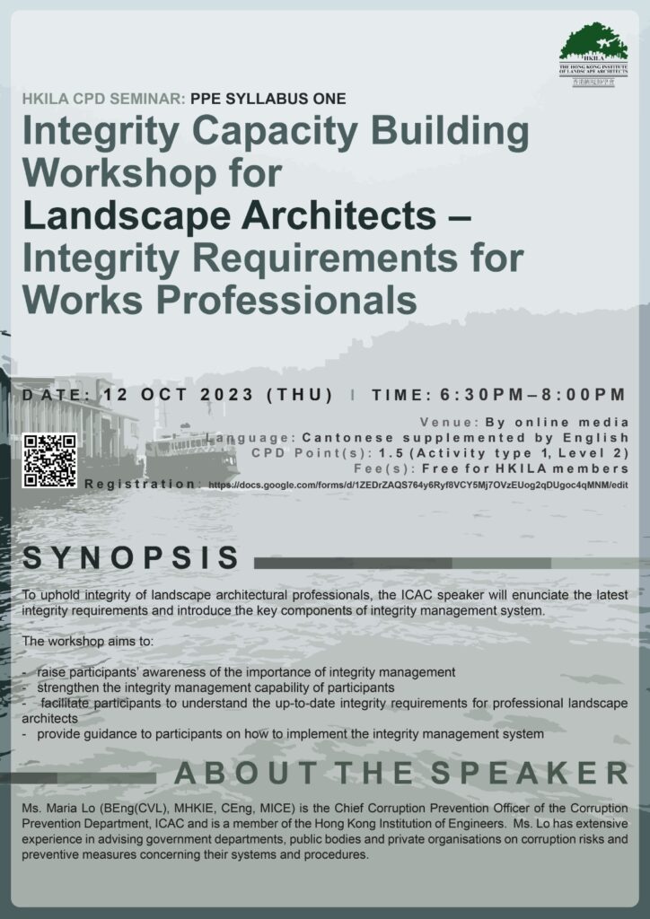 To uphold integrity of landscape architectural professionals, the ICAC speaker will enunciate the latest integrity requirements and introduce the key components of integrity management system.