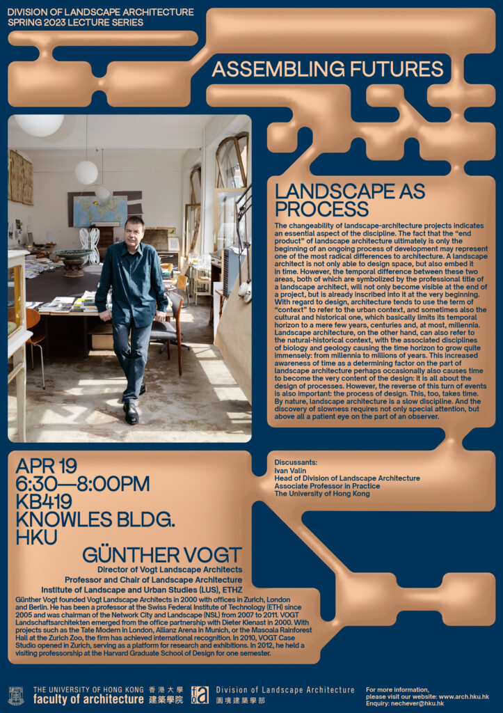 Günther Vogt founded Vogt Landscape Architects in 2000 with offices in Zurich, London and Berlin. He has been a professor at the Swiss Federal Institute of Technology (ETH) since 2005 and was chairman of the Network City and Landscape (NSL) from 2007 to 2011. VOGT Landschaftsarchitekten emerged from the office partnership with Dieter Kienast in 2000. With projects such as the Tate Modern in London, Allianz Arena in Munich, or the Masoala Rainforest Hall at the Zurich Zoo, the firm has achieved international recognition. In 2010, VOGT Case Studio opened in Zurich, serving as a platform for research and exhibitions. In 2012, he held a visiting professorship at the Harvard Graduate School of Design for one semester.