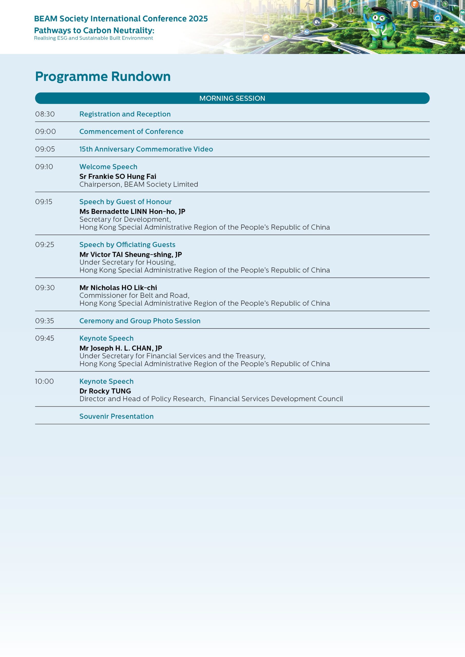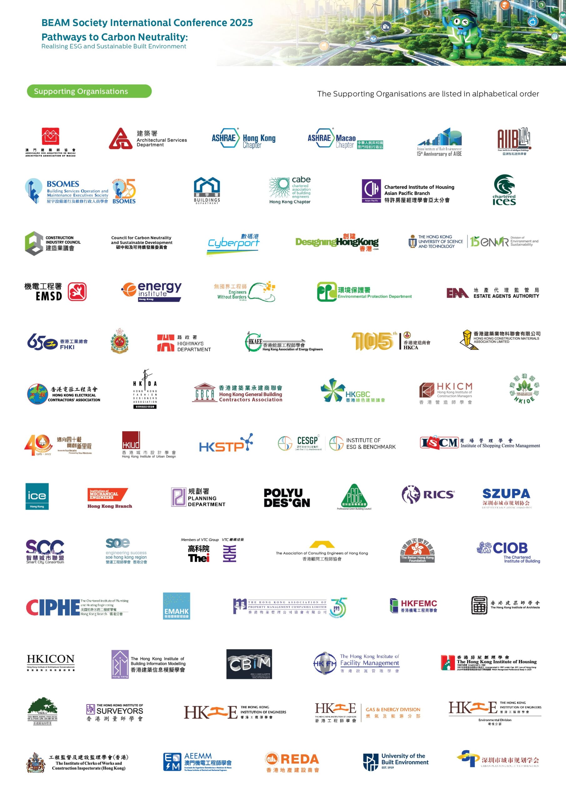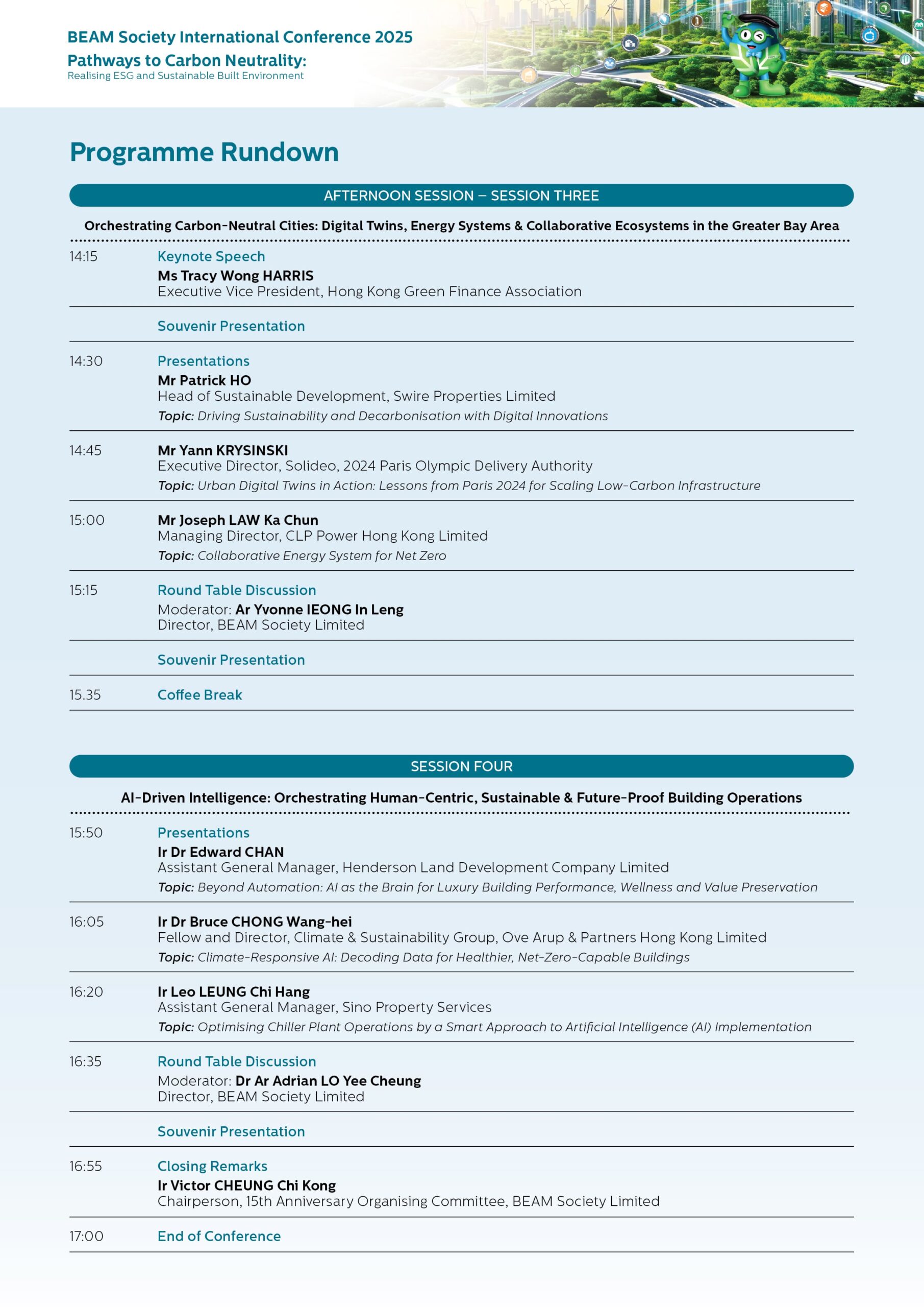 Heading to its 15th Anniversary, BEAM Society Limited (BSL) is commemorating this notable milestone by organising the BEAM Society International Conference 2025, which serves as a key platform to promote sustainable development practices and investment strategies. Themed “Pathways to Carbon Neutrality: Realising ESG and Sustainable Built Environment!”, the Conference will deliberate on the Environmental, Social, and Governance (ESG) implementations, including discussions on green finance advancement, digital transformation, artificial intelligence for building life cycle, and green assessment tools and certification. Remarkable green advocates and academics will share international case studies, further advancing our mission to creating a more sustainable built environment for the community and achieving the carbon neutrality goal set out in Hong Kong’s Climate Action Plan 2050. The Conference will facilitate the connectivity and deepen collaborations across the Greater Bay Area region, creating synergies that align with the mainland’s shared sustainability objectives. These efforts are fully aligned with the goals outlined in the Chief Executive’s Policy Address 2024.