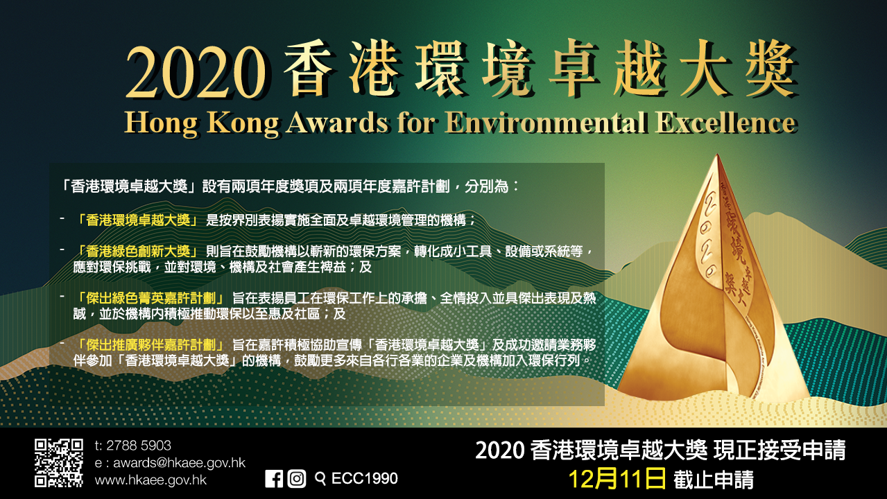 The Awards are led by the Environmental Campaign Committee (ECC) together with the Environmental Protection Department and in conjunction with nine organisations, they aim to encourage organisations to implement environmental management, to measure organisations’ performance on their commitment to environmental management, and to recognise organisations with excellent performance on environmental management.