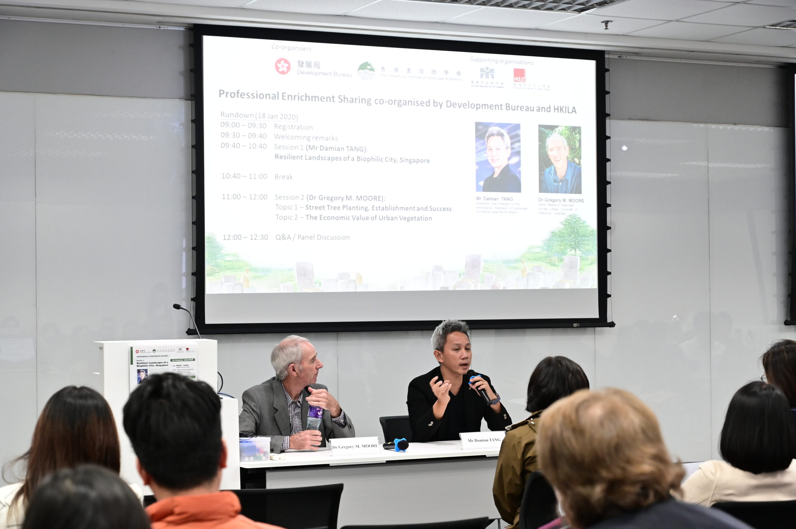 Professional Enrichment Sharing Session was co-hosted by Development Bureau and HKILA on 18 January (Sat) morning. We are very honored to have two guests Mr. Damian Tang from Singapore and Dr. Gregory Moore from Australia to share with us their insights on resilient landscapes, biophilic city, tree management and economic value of urban vegetation.