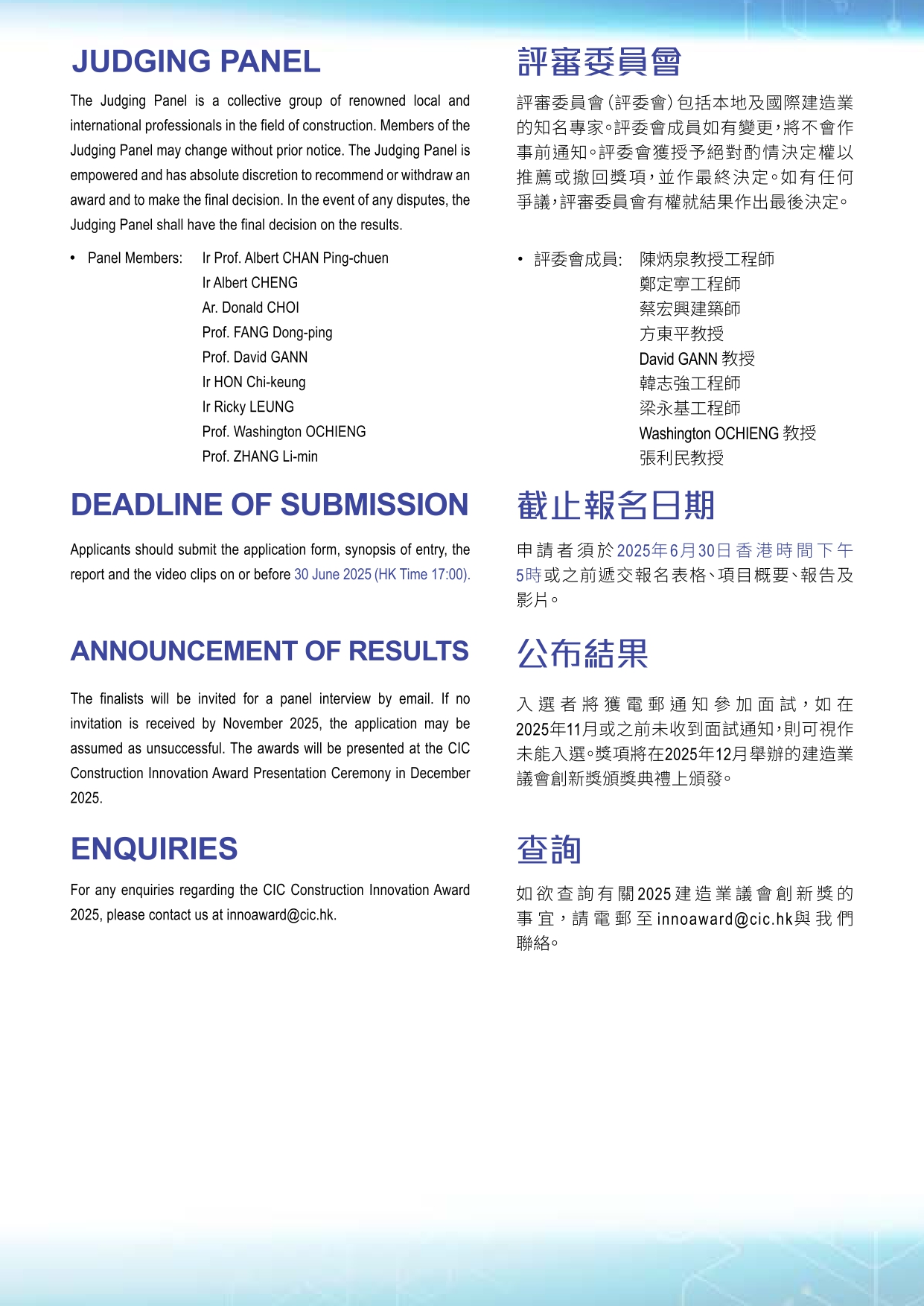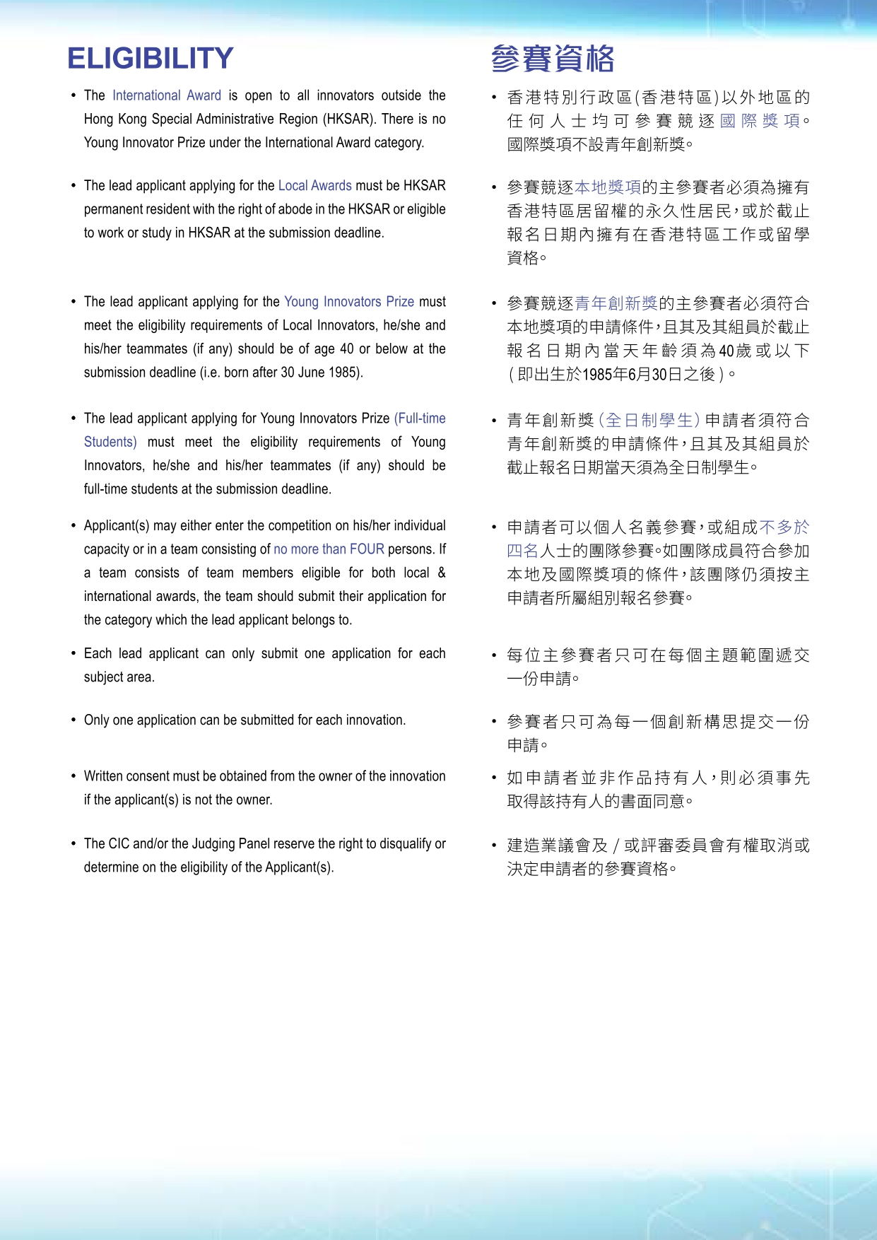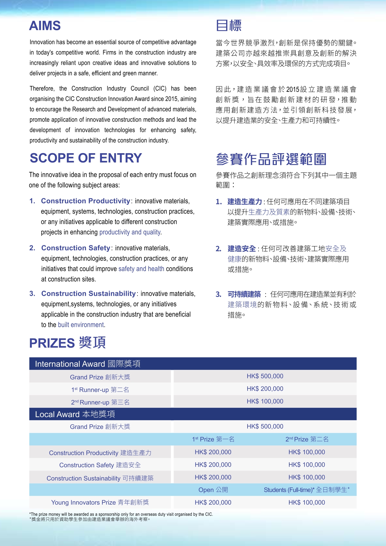 For enquiries, please contact the Organiser via Tel: 2100 9000 or via Email: innoaward@cic.hk.