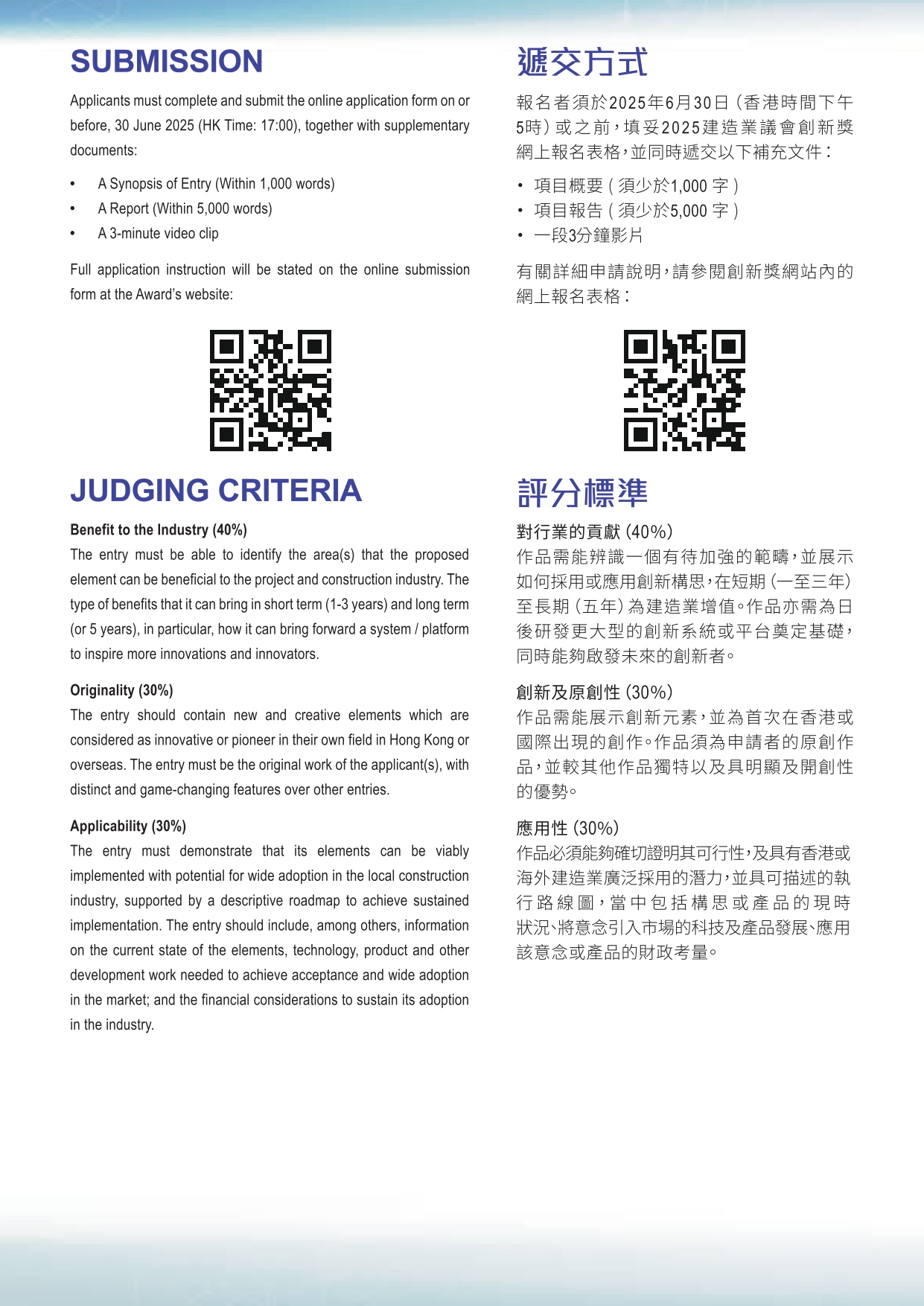 Members and all construction industry stakeholders are welcome to submit projects or products to showcase your innovation. The InnoAward 2025 is open for submission until 30 June 2025. The Award Presentation Ceremony will be held at the Construction Innovation Expo 2025 (Construction Innovation Expo 2025) on 11 December 2025, offering winners a chance to receive a prize up to HKD 500,000. More details can be found on CIC InnoAward 2025 Website and its Leaflet.